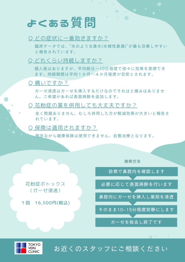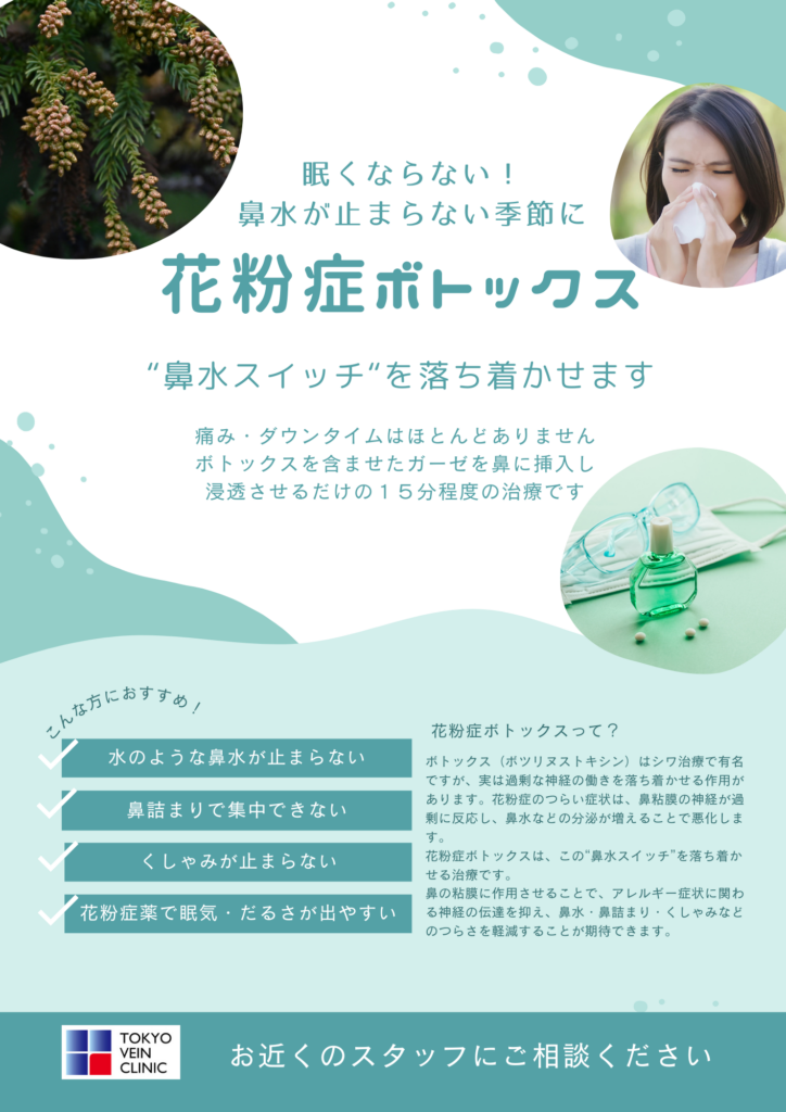 気になる方は、お電話、LINE、仮予約フォーム(ご希望の治療欄で「その他」をご選択いただき「花粉症ボトックス」とご入力ください)などでご予約ください。